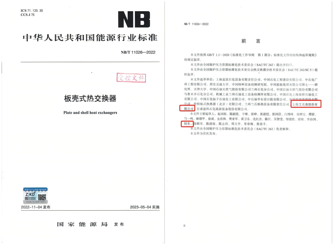 上海艾克森作為換熱設(shè)備研發(fā)、制造、銷售及服務(wù)的領(lǐng)先企業(yè)之一,深耕石油石化天然氣領(lǐng)域20 余年,是中石油一級供應(yīng)商、中石化與中海油合格供應(yīng)商,還參與能源行業(yè)多項(xiàng)標(biāo)準(zhǔn)制定,與中石化及各大院校單位聯(lián)合起草了《板殼式熱交換器》能源行業(yè)標(biāo)準(zhǔn)NB/T 11026-2022,該標(biāo)準(zhǔn)由國家能源局發(fā)布并于 2023 年 5 月 4 日正式實(shí)施,是國內(nèi)板殼式換熱器領(lǐng)域首次發(fā)布的行業(yè)標(biāo)準(zhǔn),明確了板殼式熱交換器在材料、設(shè)計(jì)、制造、檢驗(yàn)、驗(yàn)收及安裝使用等全流程的技術(shù)要求,為行業(yè)產(chǎn)品規(guī)范化、高質(zhì)量發(fā)展奠定了重要基礎(chǔ),也為 LNG 等高端能源領(lǐng)域的換熱設(shè)備應(yīng)用提供了權(quán)威技術(shù)依據(jù)。