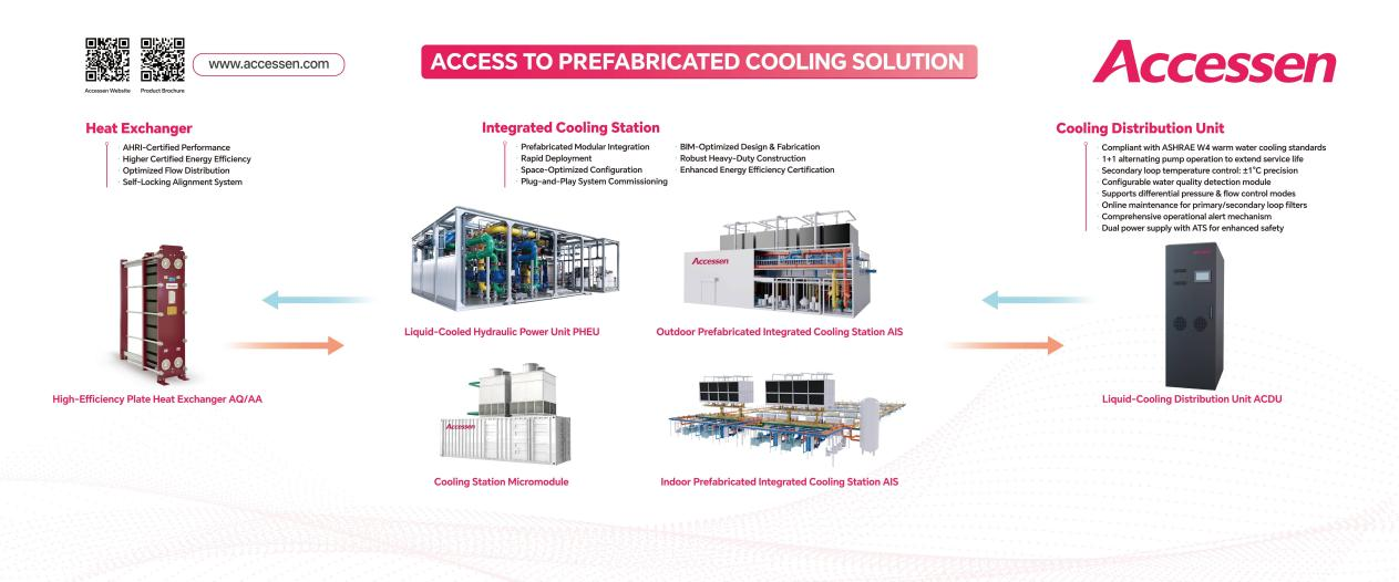艾克森的低碳綠色數(shù)據(jù)中心解決方案,以預(yù)制化集成和板式換熱技術(shù)為核心,包括箱式預(yù)制化集成冷站、液冷水力模塊和箱式微模塊集成冷站、AHRI認(rèn)證板式換熱器和液冷分配單元ACDU等產(chǎn)品的組合,助力客戶實(shí)現(xiàn)低碳交付、快速高質(zhì)量部署水冷和液冷數(shù)據(jù)中心基礎(chǔ)設(shè)施,為智慧化低碳運(yùn)營(yíng),成為高標(biāo)準(zhǔn)綠色算力基礎(chǔ)設(shè)施,支持企業(yè)客戶及大規(guī)模云計(jì)算布局提供可靠保障。