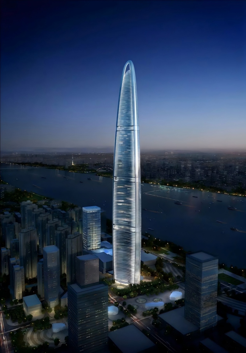 武漢綠地中心(Wuhan Greenland Center)是中國(guó)第一、全球第二高的超高層摩天大樓,由曾主持設(shè)計(jì)迪拜塔、上海金茂大廈等多個(gè)世界著名超高層的建筑設(shè)計(jì)團(tuán)隊(duì)——美國(guó)AS+GG建筑設(shè)計(jì)事務(wù)所設(shè)計(jì)建造,作為武漢綠地國(guó)際金融城項(xiàng)目的核心部分,位于武昌濱江商務(wù)區(qū)CBD核心區(qū),與漢口百年外灘隔江相望,總建筑面積約300萬(wàn)平方米,總投資逾300億元。集超五星級(jí)酒店、高檔商場(chǎng)、頂級(jí)寫(xiě)字樓和公寓等于一體的超高層城市綜合體,將由泰國(guó)正大集團(tuán)、美國(guó)萬(wàn)豪酒店集團(tuán)分別負(fù)責(zé)高檔商場(chǎng)和白金五星級(jí)酒店的運(yùn)營(yíng)。大樓主塔底座俯視圖成“三瓣形”,是武漢三鎮(zhèn)地勢(shì)的抽象化體現(xiàn),主塔外觀呈流線(xiàn)型,下粗上細(xì),頂部是一個(gè)光滑的穹體。